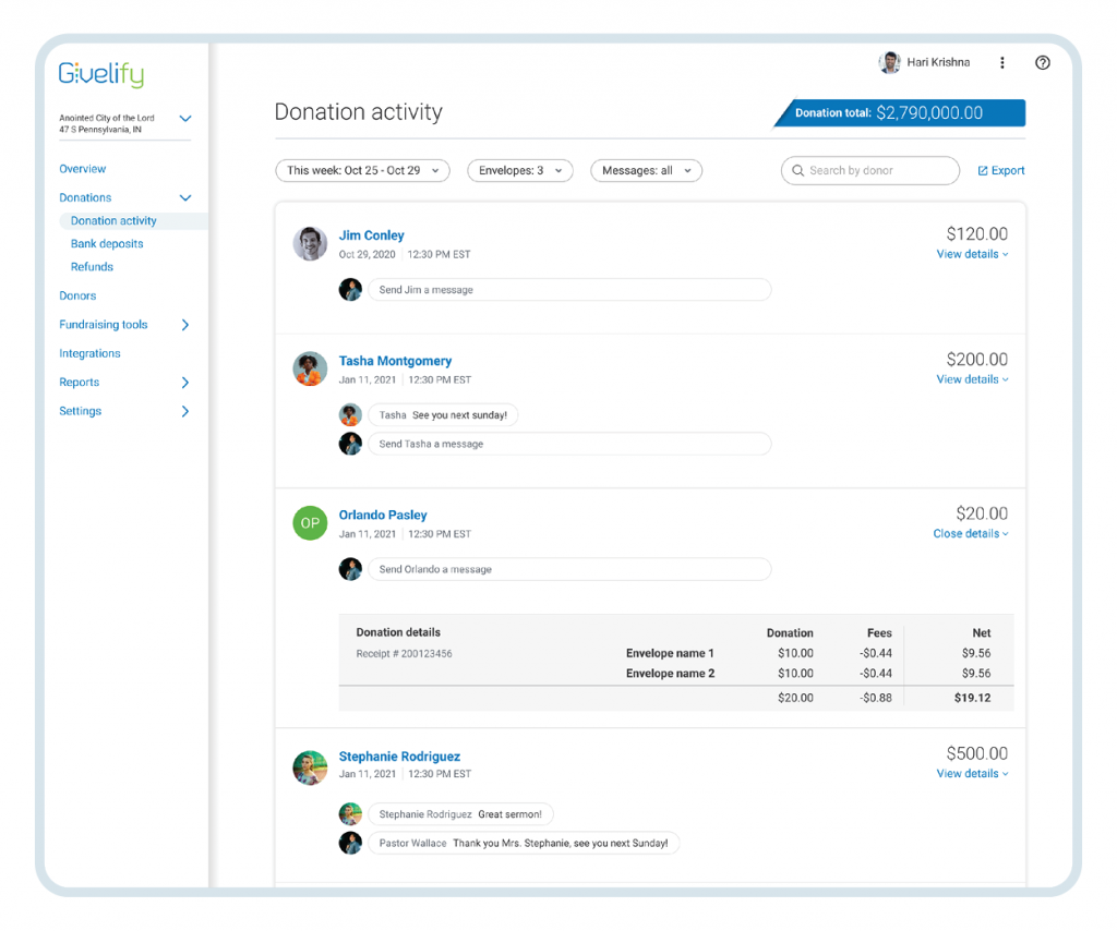 - A breakdown of giving by envelopes (to which causes people donated the most)