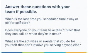 • When is the last time you scheduled time away or off for self-care? • Does everyone on your team have their “three” that they can call on when they’re in need? • What are the activities or events that you do for yourself that don’t involve you serving anyone else?