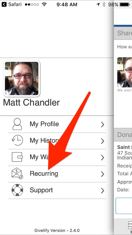 You can check and edit your recurring donations by tapping on Me, then on Recurring.
