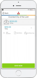 4. You will see your memo on the screen beneath your donation amount. If you see that you have made an error, you can edit your memo before completing your donation. Otherwise, tap “Give Now.”